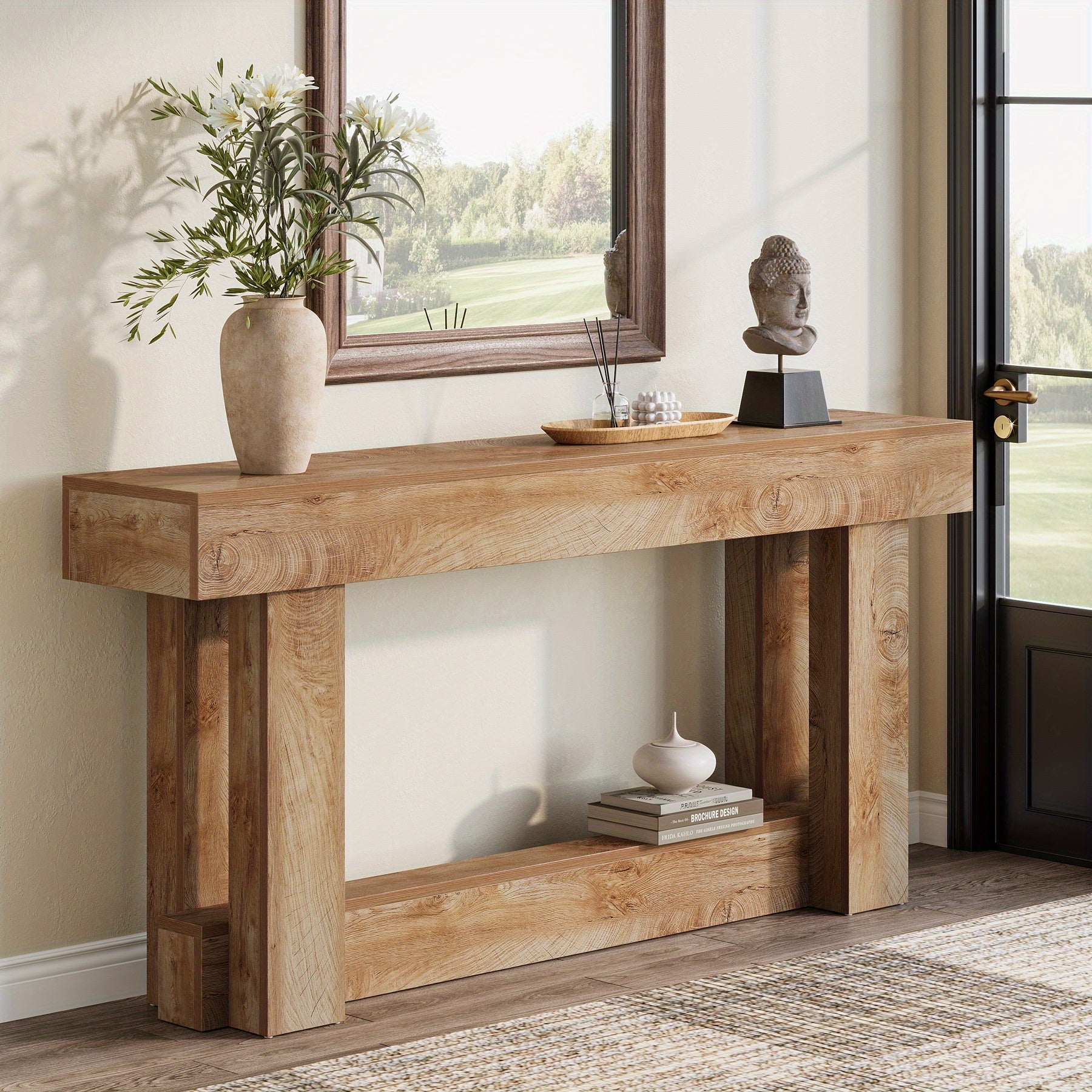 2-Ebenen-Konzept: Der 63 Zoll lange, schmale Holz-Tisch für den Eingangsbereich bietet großzügigen Platz zur Präsentation und Aufbewahrung von Gegenständen. Das Design der unteren Ebene verleiht nicht nur einen modernen, stilvollen gestuften Effekt, sondern dient auch als zusätzlicher Stauraum oder Ausstellungsfläche