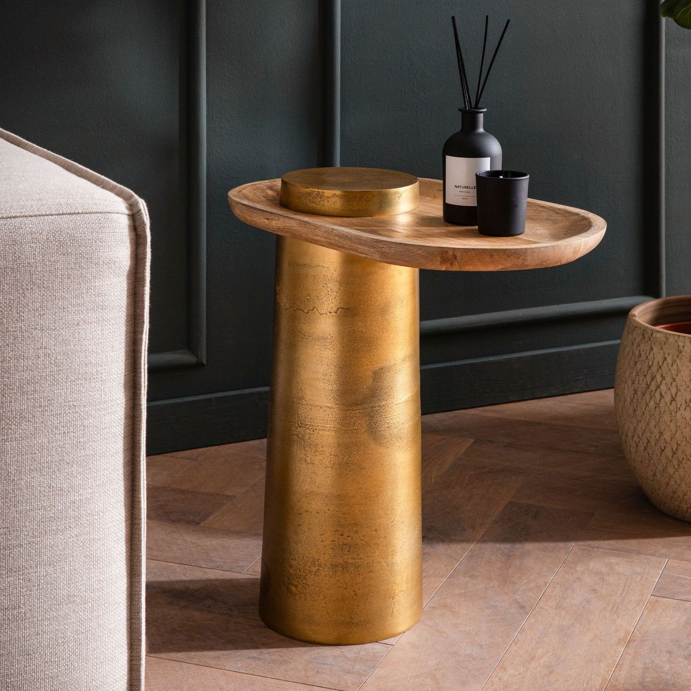 PRAKTISCHES ACCESSOIRE - Die Kombination aus der warmen, hellbraunen Holzplatte und dem goldfarbenen Standbein verleiht diesem Tisch einen edlen, modernen Look.