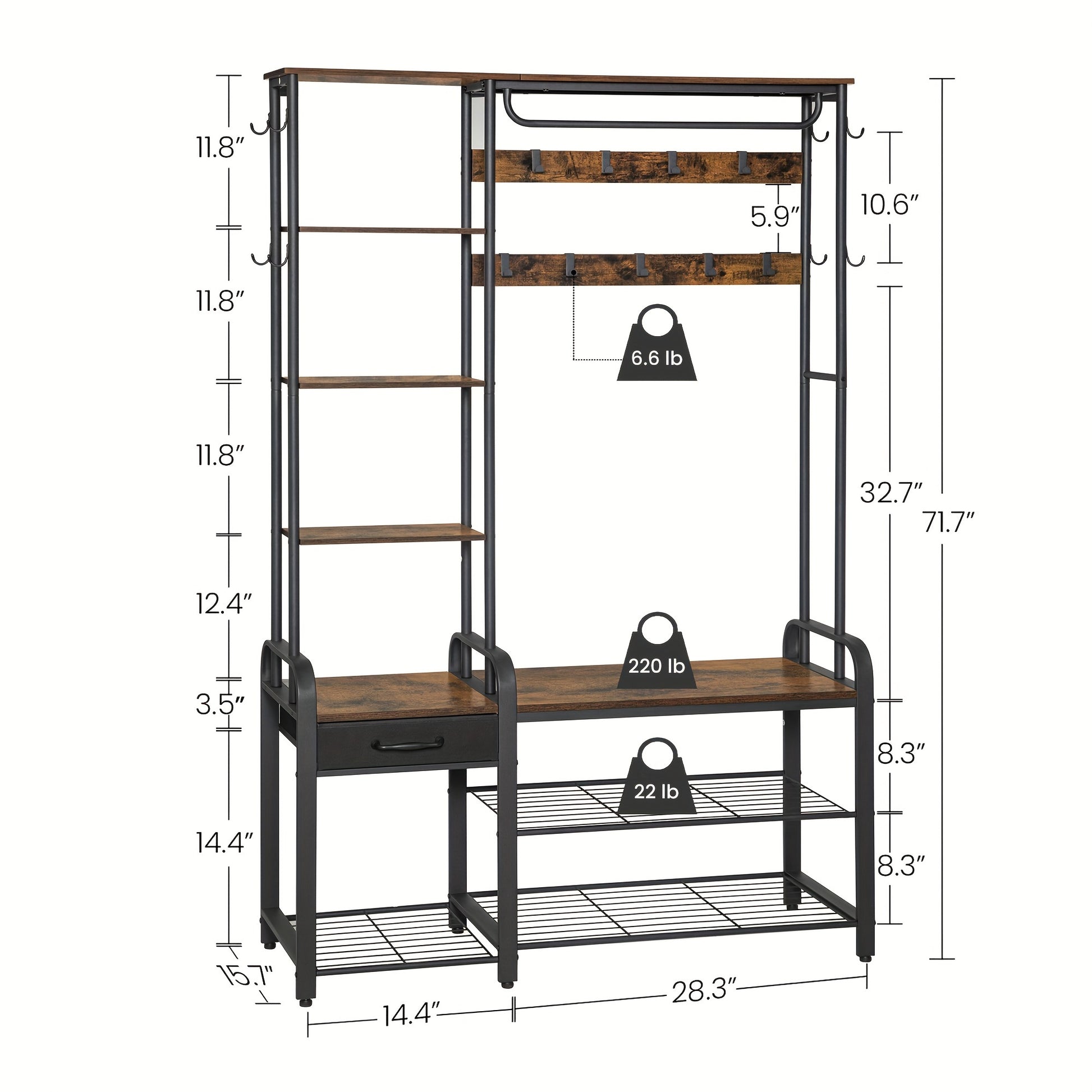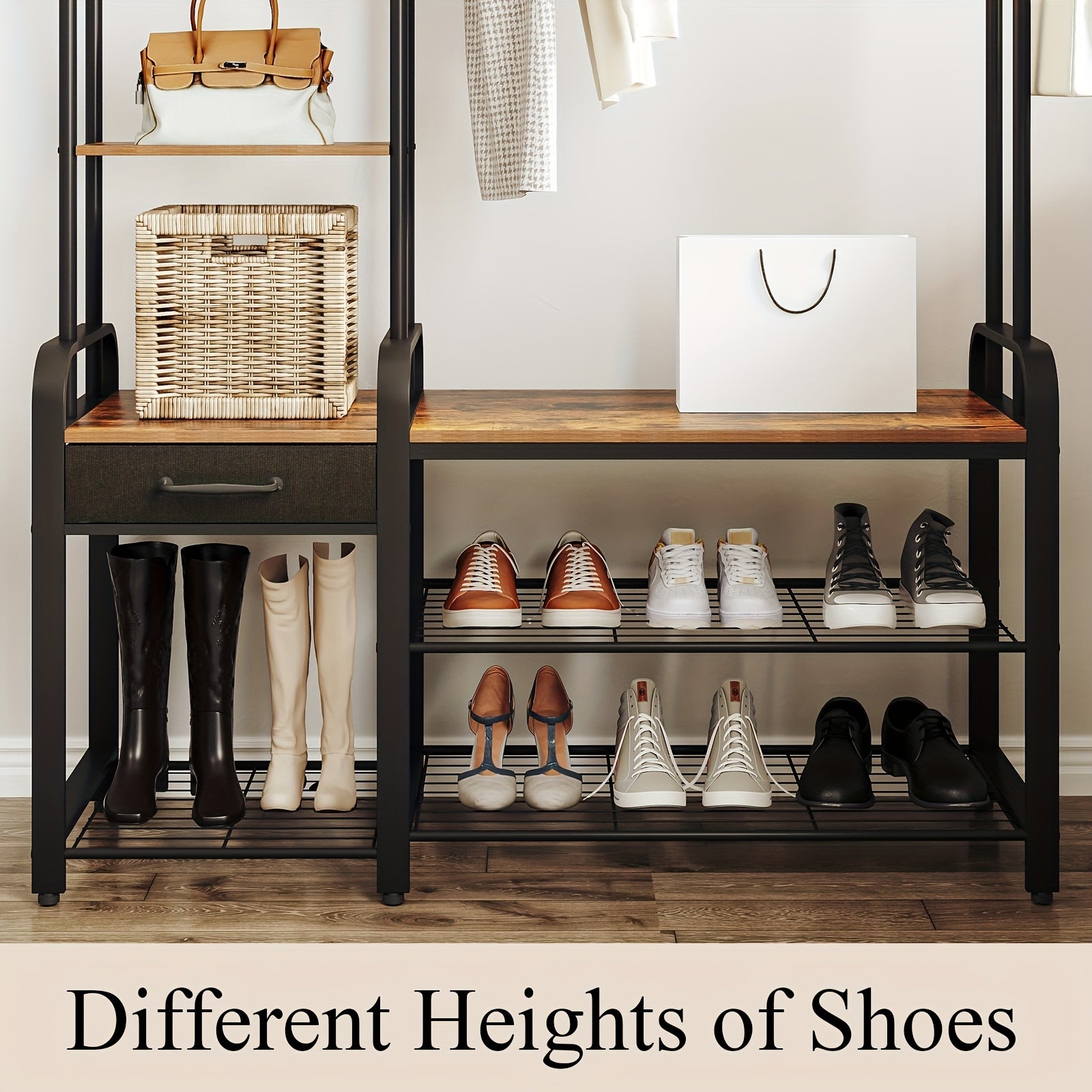 Kleiderständer mit Bank, Kleiderständer mit 3-stufiger Schuhbank, 1 Schublade, 5-in-1 Kleiderständer mit 17 Haken, 1 Hängebar, 4-stufige Seitenschrank, 40 x 120 x 182 cm, braun und schwarz