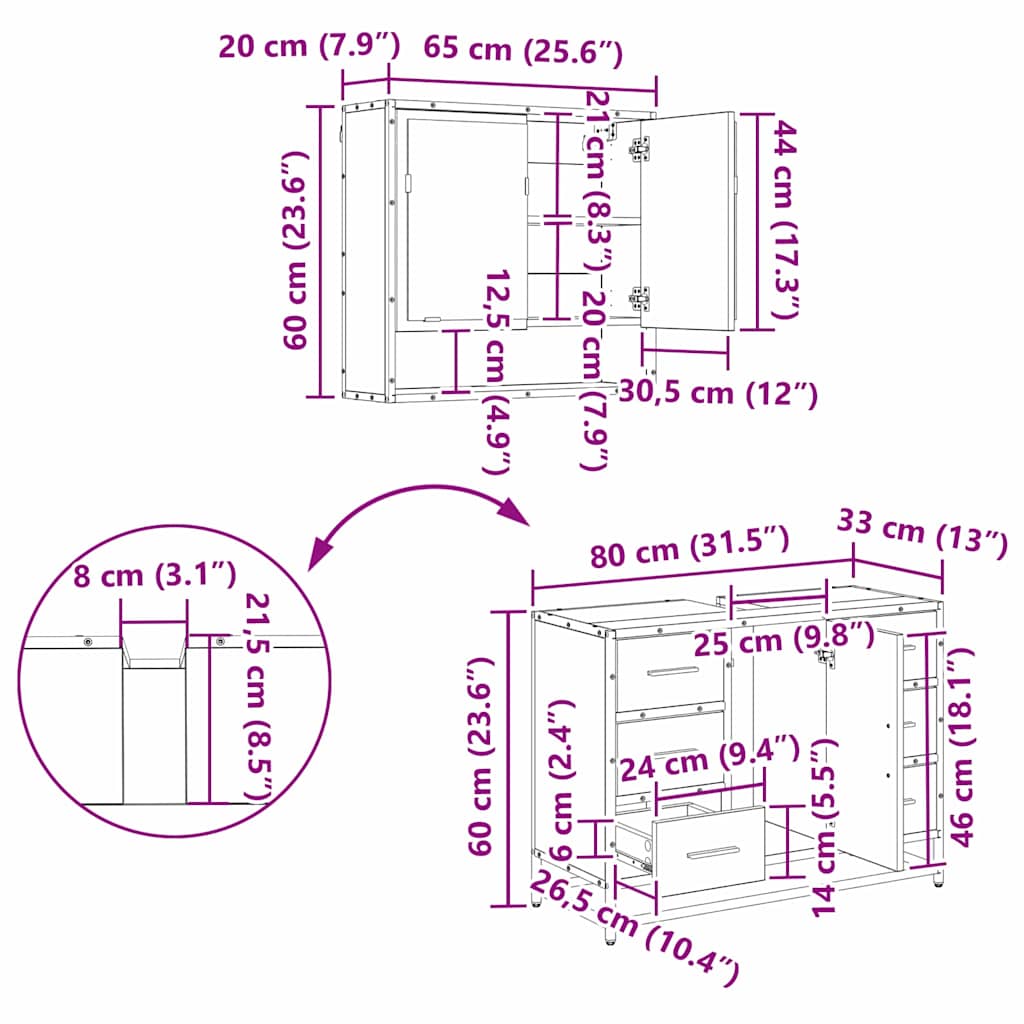 Dieses rustikale Badezimmermöbelset verbindet Praktikabilität mit charmantem rustikalen Stil und verleiht jedem Bad einen tollen Touch. Mit seiner strukturierten Oberfläche und den beruhigenden Erdtönen sorgt es für eine gemütliche und einladende Atmosphäre. Stell dir vor, wie gut dieses Set in einem behaglichen Bad aussieht, wo es sich perfekt zum Entspannen eignet mit seinem natürlichen Look. Materialien: Komplett aus Holzwerkstoff gefertigt, ist dieses Set robust und hat einen schönen natürlichen Touch, ideal für Fans von rustikalen Designs. Die Materialwahl sorgt für eine stabile Konstruktion und sieht gleichzeitig schick aus, um die Bedürfnisse eines Badezimmers zu erfüllen. Enthaltene Komponenten: Das Set umfasst einen Waschbeckenunterschrank und einen Spiegelschrank, beide mit eingebauten Regalen für clevere Organisation. Damit bleibt dein Badezimmer ordentlich, während der Spiegel Stil und Praktikabilität hinzufügt. Funktionen / Design: Durch die wandmontierte Bauweise bleibt mehr Platz am Boden, was den Raum leicht und luftig wirken lässt. Die Türen mit guten Scharnieren lassen sich einfach öffnen, und die klassischen Schubladen machen es leicht, das zu greifen, was du brauchst – perfekt für deine tägliche Badezimmerroutine. Empfohlene Verwendungen: Dieses Möbelset passt in Badezimmer jeder Größe und ist ideal für die, die sowohl Stil als auch Stauraum brauchen. Es funktioniert sowohl in kleinen Gästebädern als auch in größeren Bädern und bietet viel Stauraum, während es diesen rustikalen Charme bewahrt. Pflege & Wartung: Wische es einfach mit einem trockenen Tuch ab, um Staub und Feuchtigkeit zu entfernen. Halte dich an die Montageanleitungen des Herstellers für die beste Stabilität und Lebensdauer.